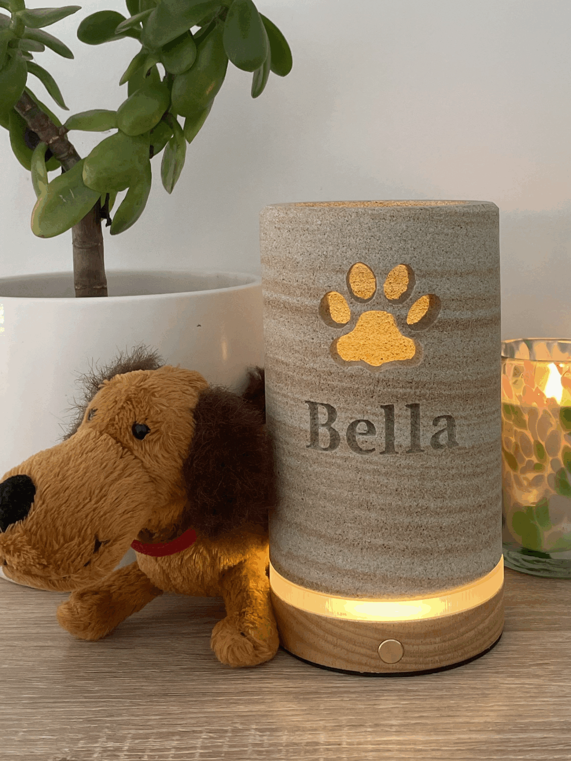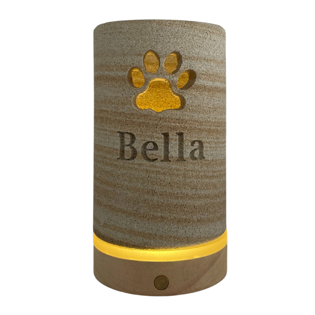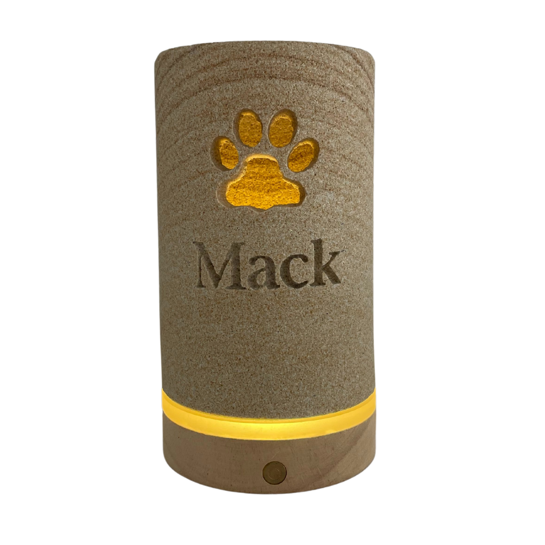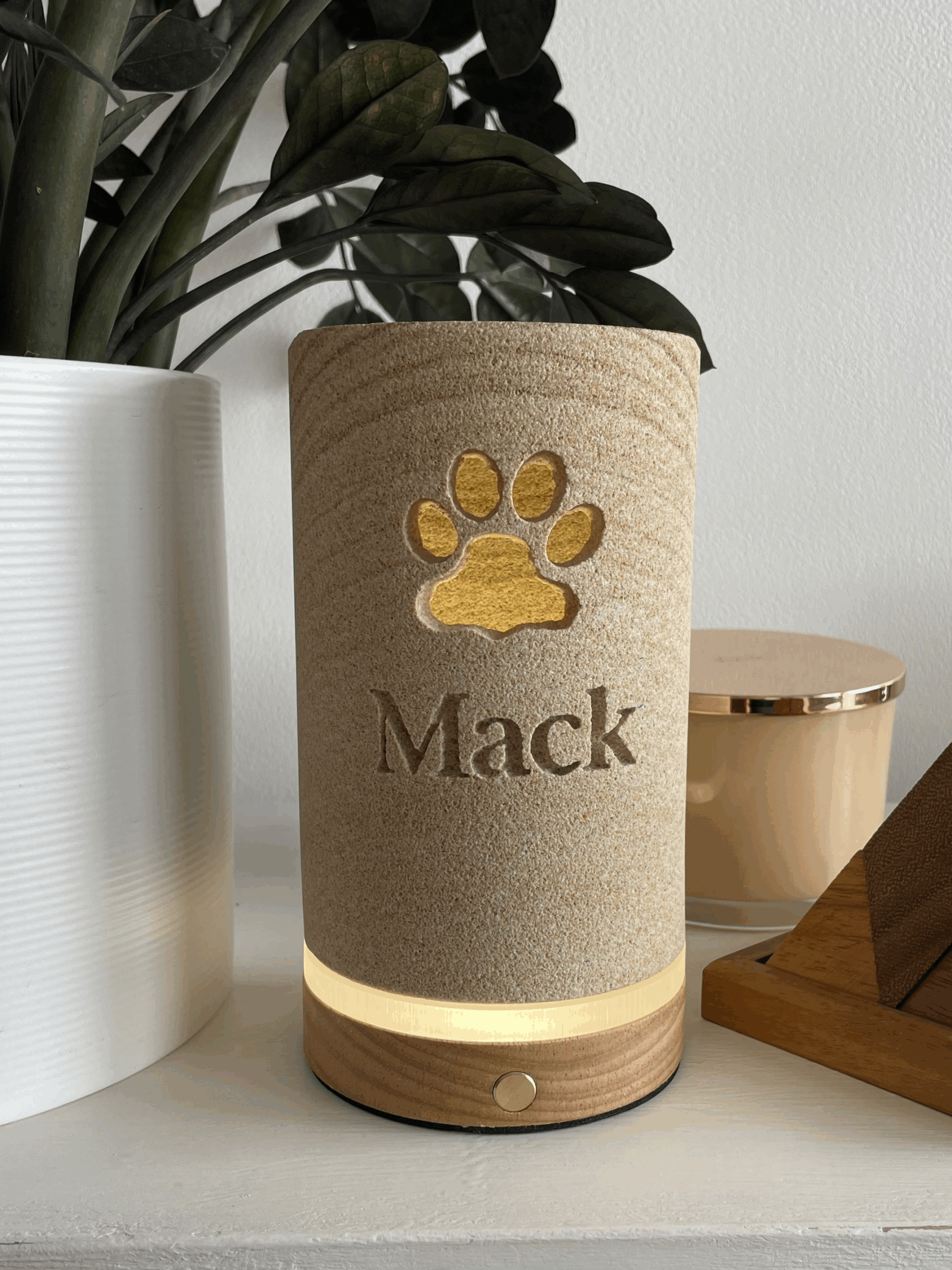 Inside the base is a soft LED light with three gentle settings. When lit, the glow shines through your chosen design, casting a peaceful light that fills the space with love and reflection. The light is rechargeable and easy to control with a small switch underneath.