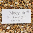 Square Sandstone Plaque – 30 x 30 x 2.5cm – Deeply engraved lettering. At Top – Graphic/Personalised Pawprint; 1st Line – 10 spaces of text; 2nd line – 21 spaces of text; 3rd line – 21 spaces of text; 4th line – 21 spaces of text; 5th Line – 9 spaces of text (these spaces includes the spaces between any words)