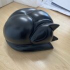 Attractive resin sleeping cat urn access the receptacle for placement of ashes underneath.