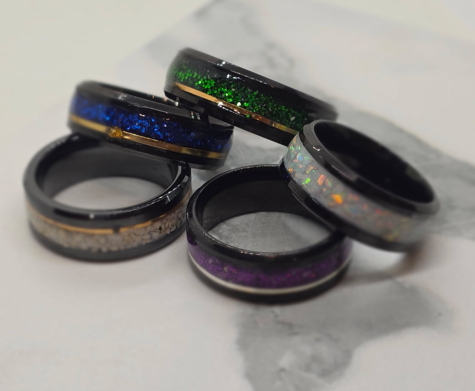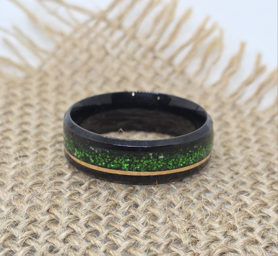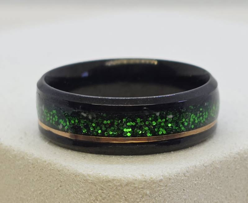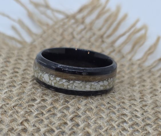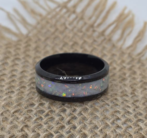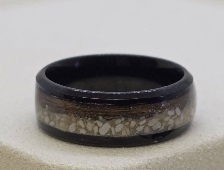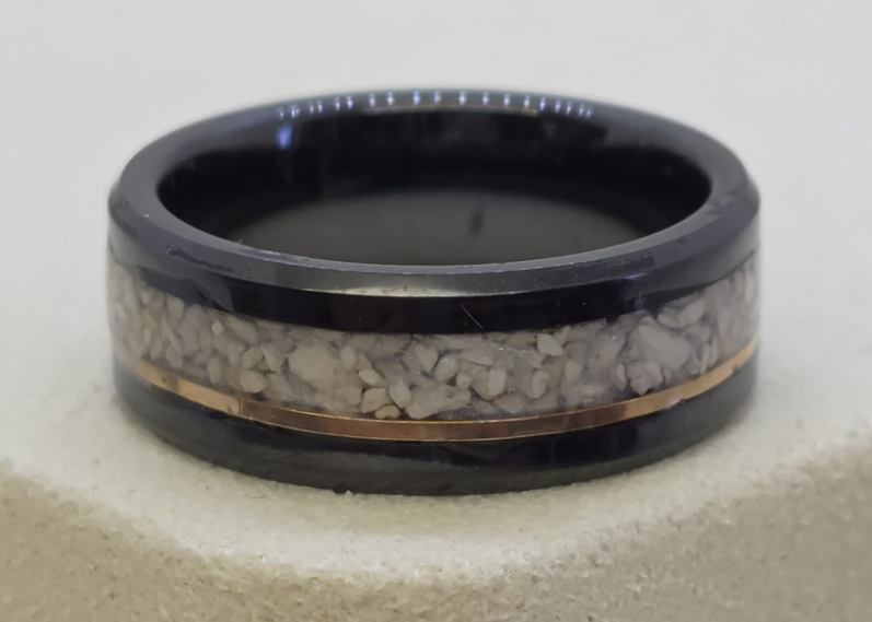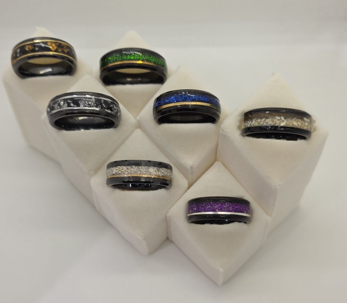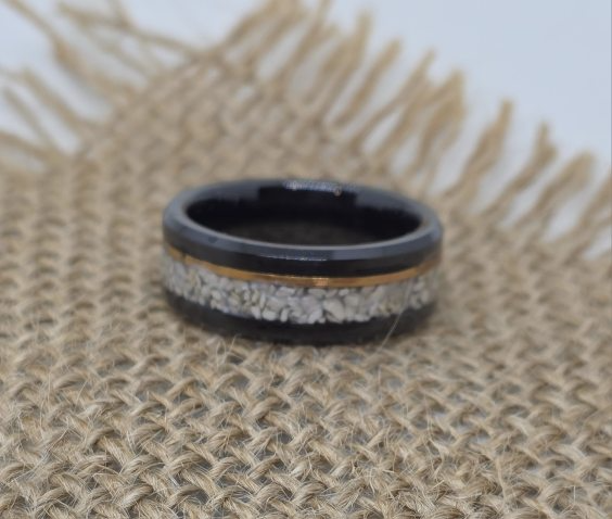 We transform the ashes of your loved one into a unique keepsake to cherish in the form of a Black Ceramic Ring with your chosen colour with your loved one’s ashes. Various sizes available – if you determine your ring size by measuring the inside diameter of a current ring that fits.